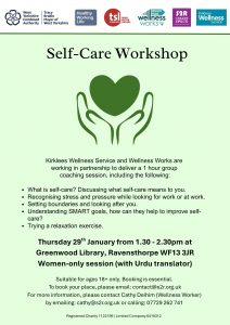 Self care Workshop- Women only Greenwood library Ravensthorpe WF13 3JR –  29th January 1.30-2.30 pm– English and Urdu posters below. Booking essential. Contact contact@s2r.org.uk